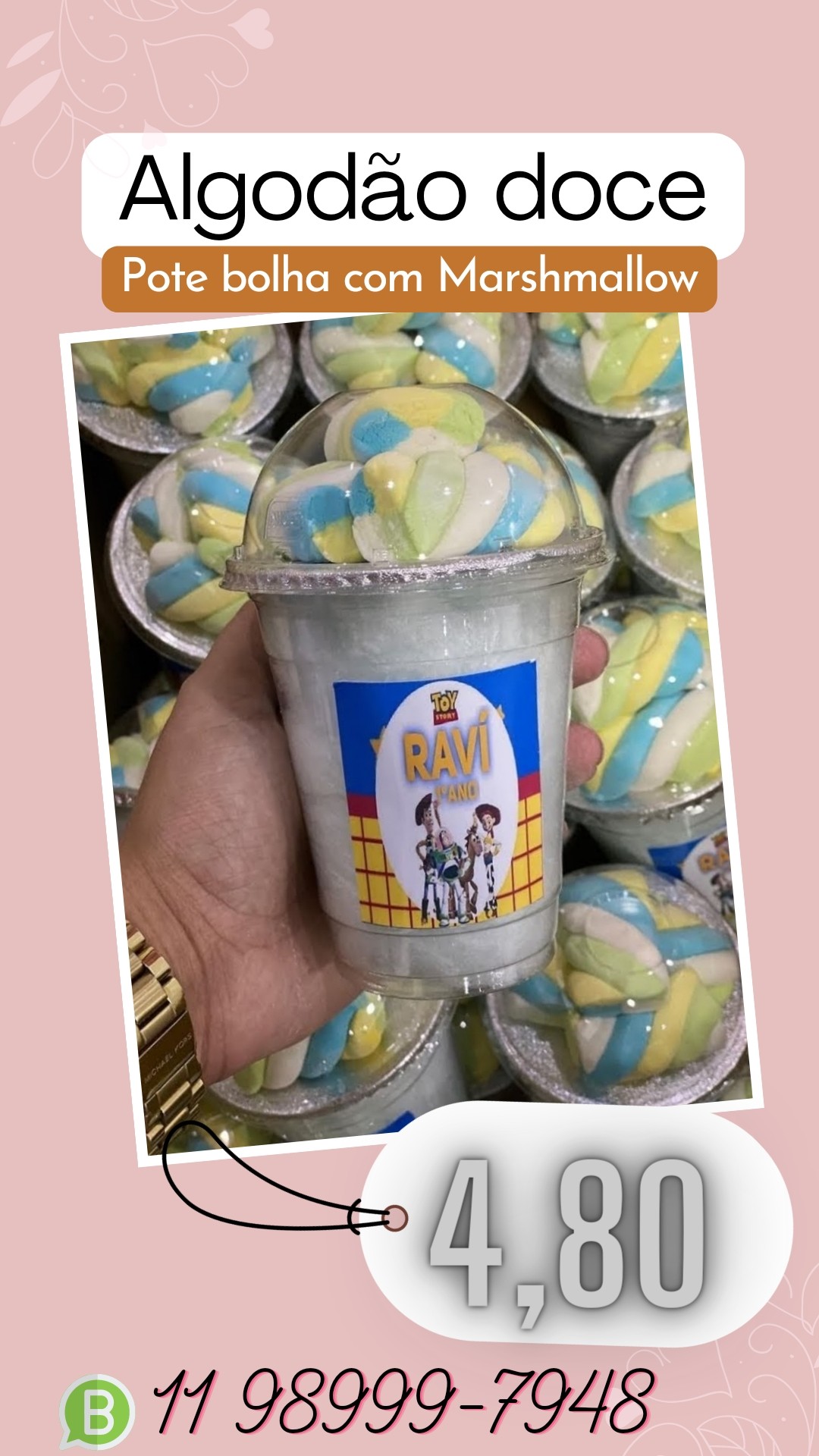 ALGODÃO DOCE NO POTE BOLHA COM MARSHMALLOW PERSONALIZADO.De:R$ 5,60Por: R$ 4,80 -